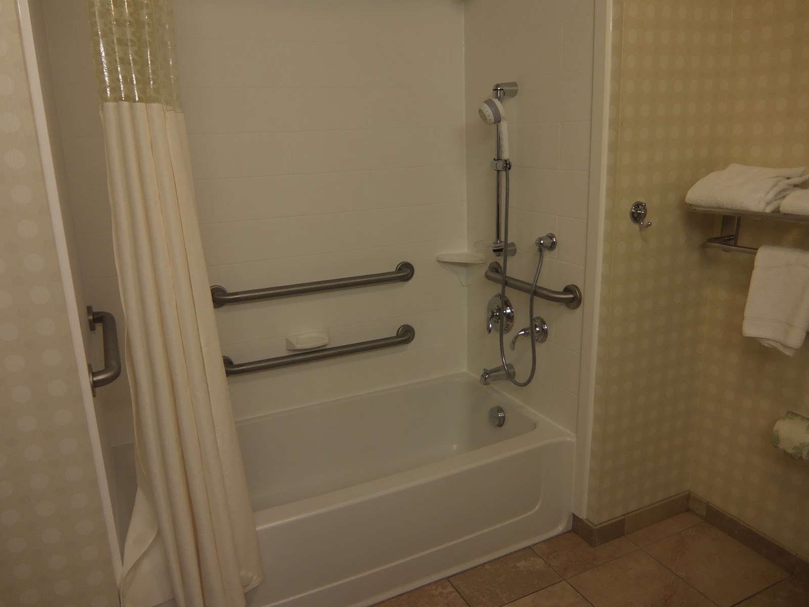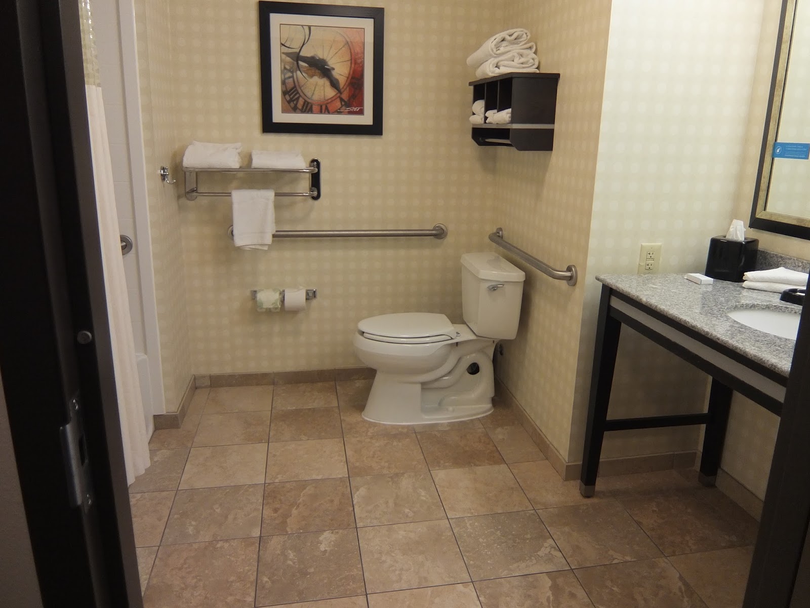 This room was very large with 5′ on each side of the bed to allow for easy maneuverability for someone in a wheelchair. Great job utilizing universal design in the hotel room Hampton Inn!!
